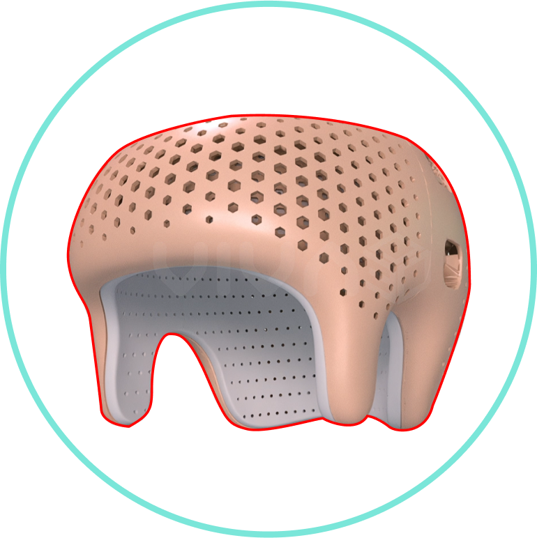 3D 설계 프로그램을 이용하여 헬멧의 외부 라인을 아기 두상에 맞춘 인체공학적 형태로 설계하여 외피의 추가 변경 없이 완성된 헬멧으로 바로 착용 가능
