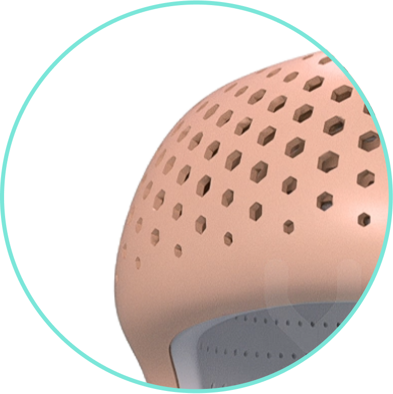 이중 구조 외피 설계를 통해 헬멧 내부가 비어 있어 공기를 순환시키고, 헬멧의 무게를 낮춘 구조